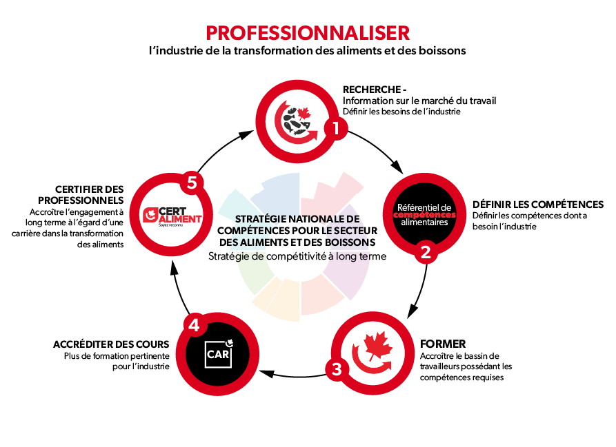 Nous identifions les lacunes et y répondons avec des modèles de compétences pour professionnaliser la main-d’œuvre comme le Cadre d’apprentissage et de reconnaissance de l’industrie canadienne de la transformation des aliments et des boissons, le premier du genre reconnu mondialement