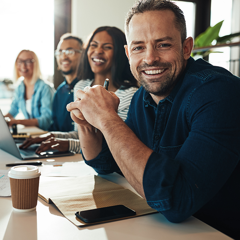 Smiling mature businessman sitting with colleagues in an office
