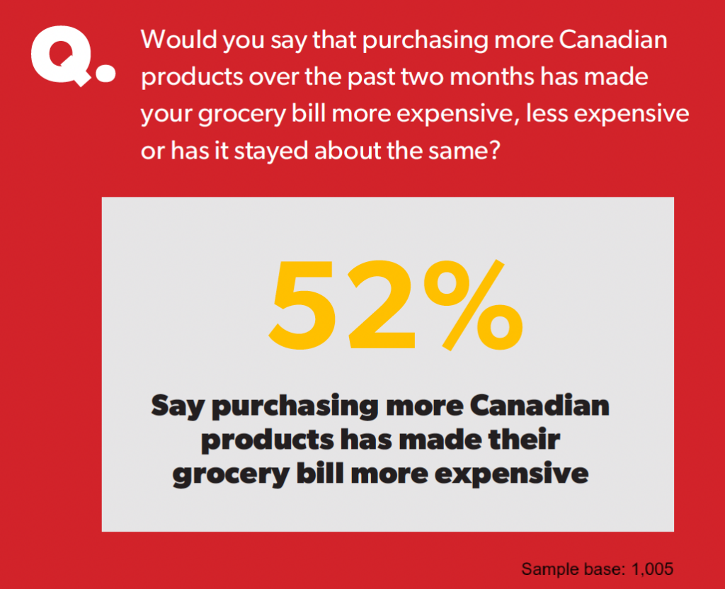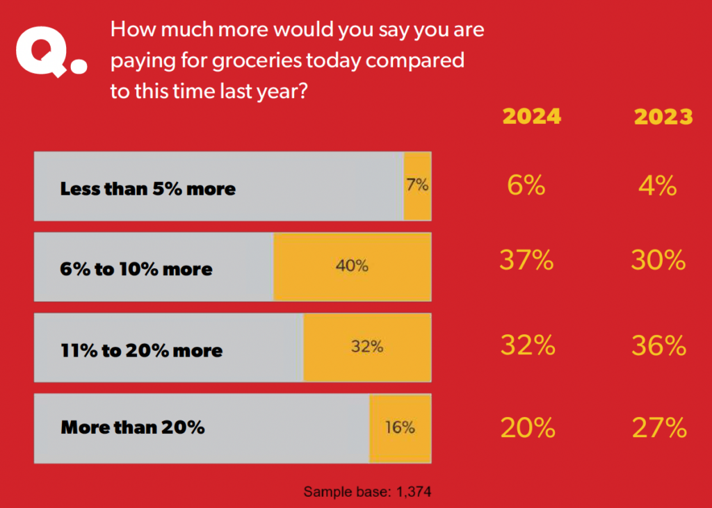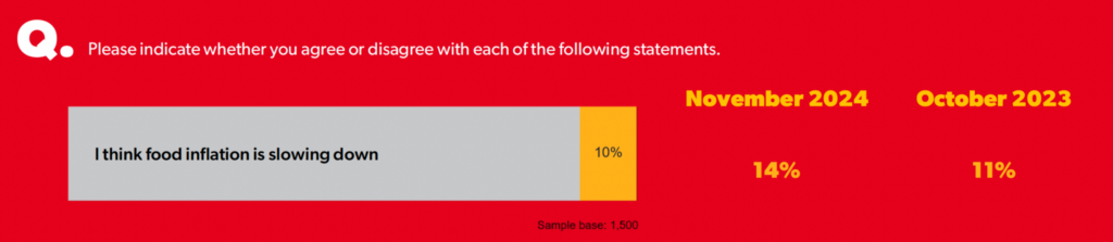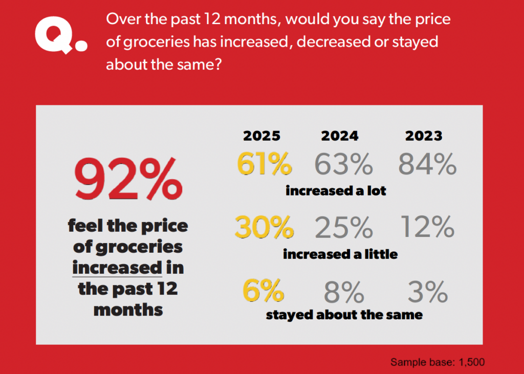Despite easing inflation, 63% of Canadians still feel grocery prices have increased "a lot", and only 14% believe food inflation is slowing down.